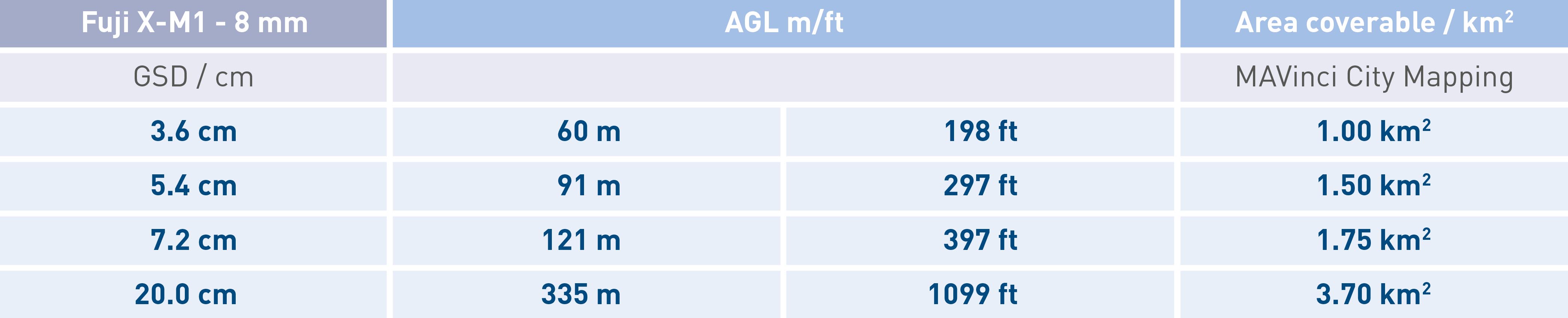 富士X-M1拥有一个特殊的8毫米镜头,用于建筑物,基础设施,建筑工地,工业区和工厂的成像。GSD范围为3.6至20厘米。一架飞机可以占地面积达3.7平方公里。通过软件扩展,您将收到城市映射模式,从而优化相应的规划,准备和处理。拍摄的照片将自动转换为纹理3D城市模型。它甚至包括垂直结构的纹理,如建筑物的正面。