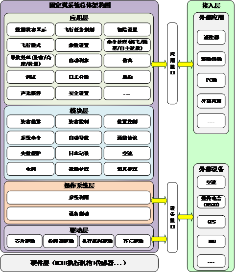 (2) 系统涵盖了姿态估算、姿态控制、位置控制、自动导航、通信协议、失效保护、系统命令、日志记录、视频处理等基础功能,同时在这些基础功能之上,提供了各种丰富的应用功能,包括数据状态显示、飞行任务规划、飞行模式设定、命令处理、导航处理、自动调参、仿真、调试等。