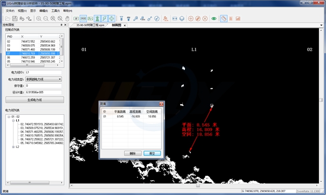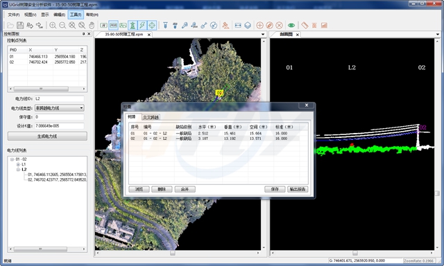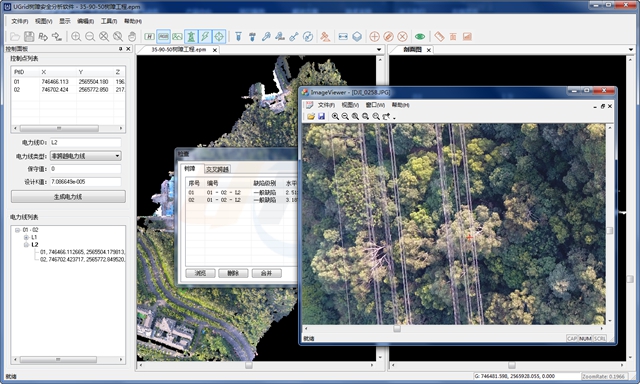 Ugrid树障分析软件是基于图像密集点云匹配和立体测图技术,针对输电线路通道导线弧垂建模、树障安全距离分析、交叉跨越距离测量研发的图像分析软件。 通过无人机获取通道图像数据分析树障问题,相比激光雷达技术降低了树障隐患防范的技术经济门槛。