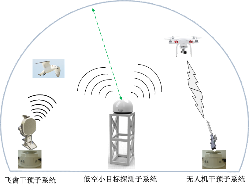 低空小目标探测子系统由低空小目标探测雷达、光电探测设备和远程监控设备组成,用于对空域内侵入目标的探测、监视、识别、跟踪和确认,并向干预子系统提供定向引导功能。