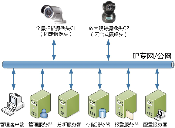 系统由各类服务器、管理客户端、固定摄像头、云台摄像头组成。