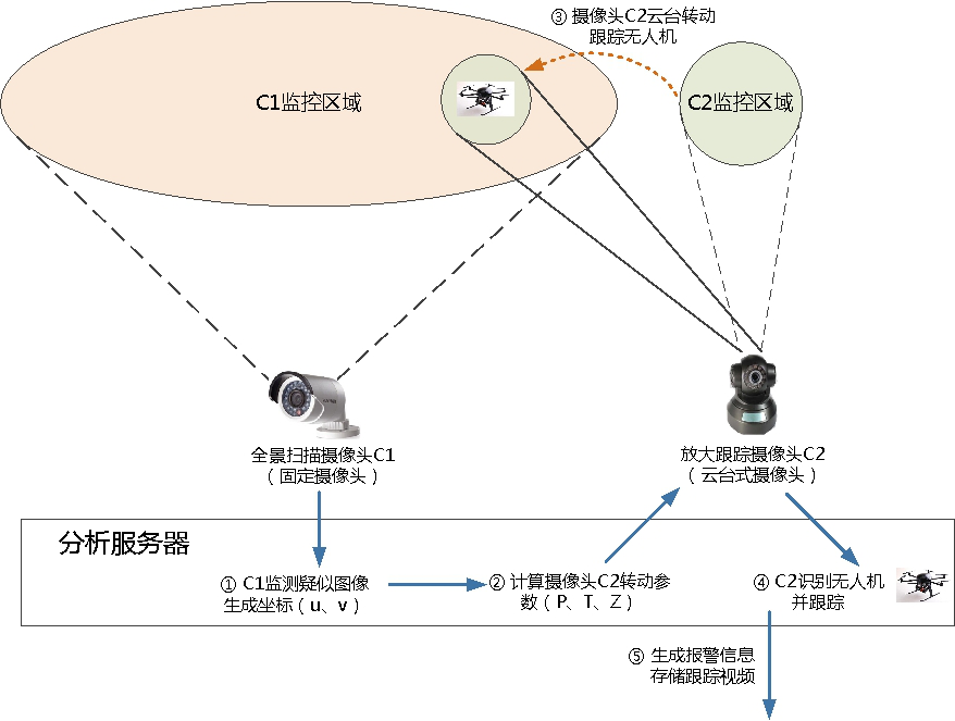 该方案提出了一种通过摄像头云台联动进行近中距离无人机识别跟踪的一般方法。