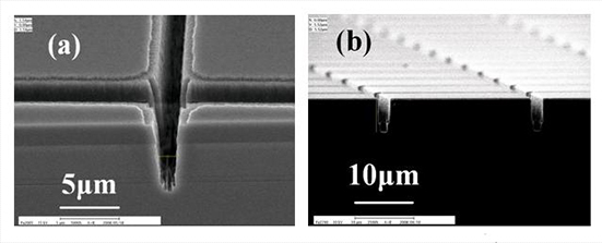 然后将样品浸入HF水溶液中,如图2(d)所示,在ICP刻蚀后刻蚀牺牲AlAs层和剩余的SiO2掩膜模板。ELO浸没时间必须短于从GaAs衬底完全释放外延膜所需的蚀刻时间。在AlAs层的快速湿蚀刻之后,每个长方体下方都会留下非常小的AlAs。这种微小的AlAs不仅固定在GaAs衬底上的每个长方体上,而且可以很容易地卡住,如图5所示。