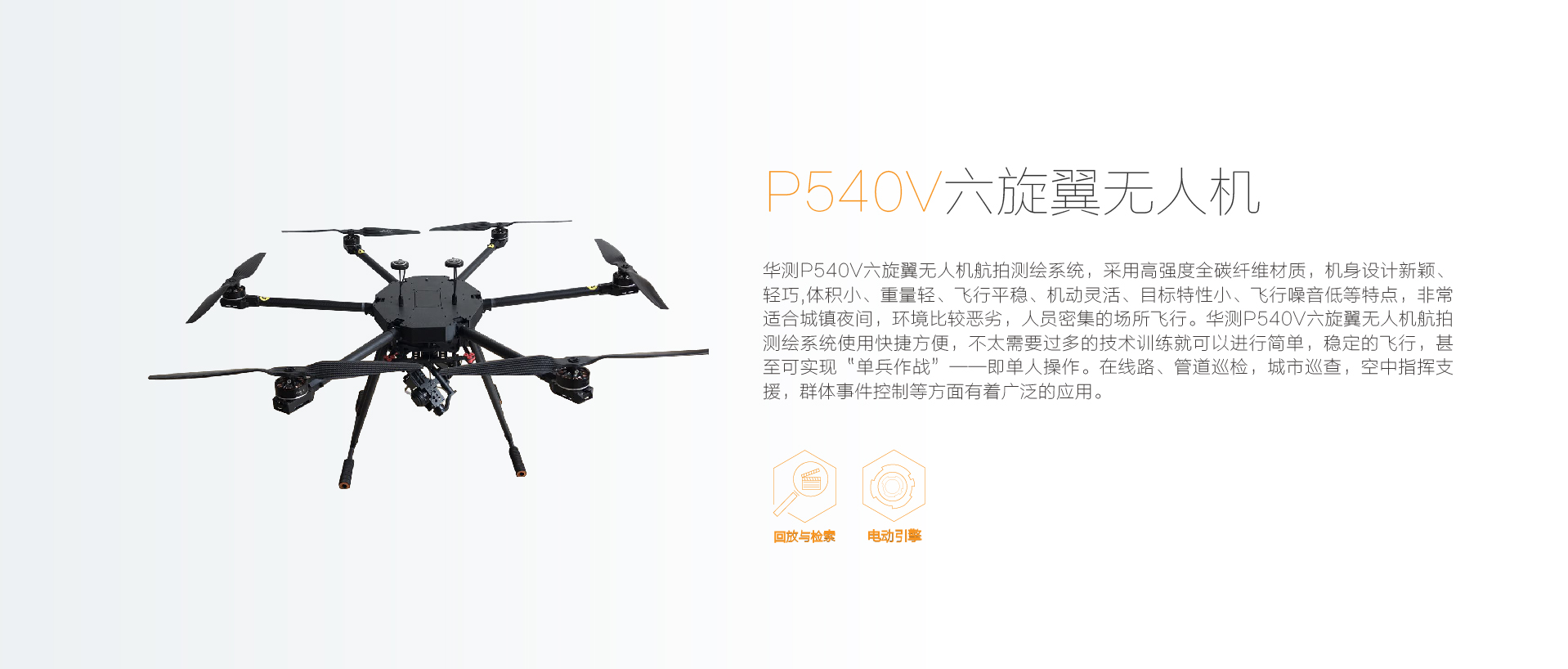 华测P540V六旋翼无人机航拍测绘系统,采用高强度全碳纤维材质,机身设计新颖、轻巧,体积小、重量轻、飞行平稳、机动灵活、目标特性小、飞行噪音低等特点,非常适合城镇夜间,环境比较恶的环境,人员密集场所飞行。华测P540V六旋翼无人机航拍测绘系统使用快捷方便,不太需要过多的技术训练就可以进行简单,稳定的飞行,甚至可实现“单兵作战”——即单人操作。在线路、管道巡检,城市巡查,空中指挥支援,群体事件控制等方面有着广泛的应用。