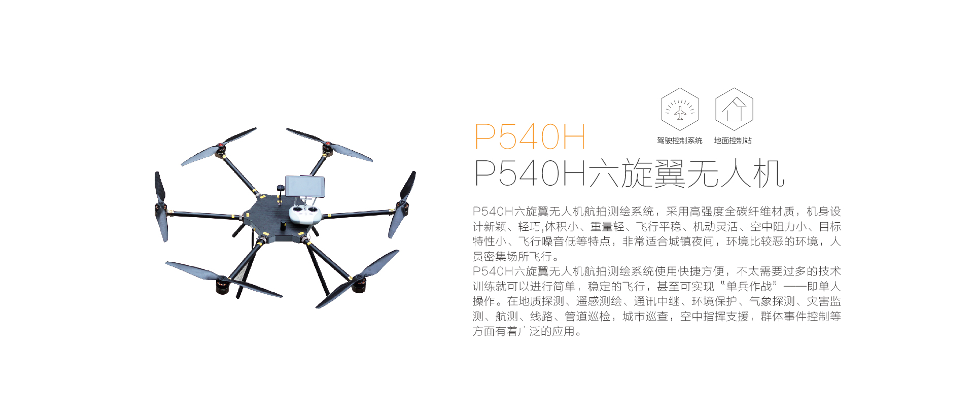 P540H六旋翼无人机航拍测绘系统使用快捷方便,不太需要过多的技术训练就可以进行简单,稳定的飞行,甚至可实现“单兵作战”——即单人操作。在地质探测、遥感测绘、通讯中继、环境保护、气象探测、灾害监测、航测、线路、管道巡检,城市巡查,空中指挥支援,群体事件控制等方面有着广泛的应用。