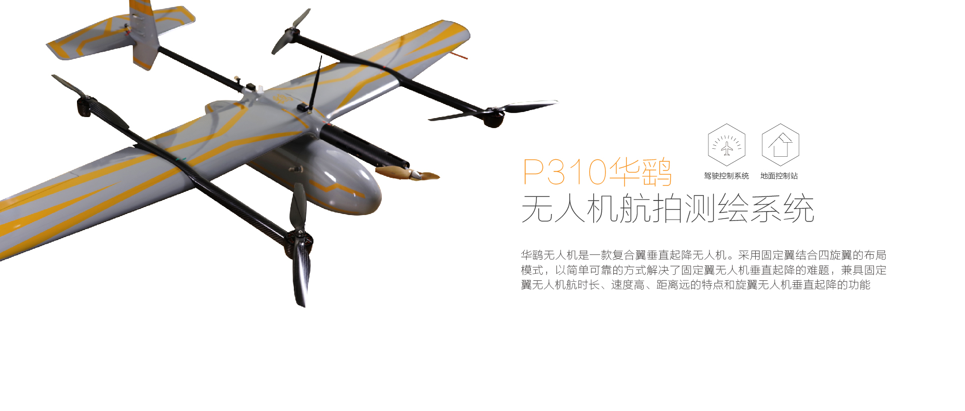 华鹞P310是我公司最新研发的复合翼垂直起降无人机,采用固定翼结合四旋翼的复合翼布局形式,以简单可靠的方式解决了固定翼无人机垂直起降的难题,兼具固定翼无人机航时长、速度高、距离远的特点和旋翼无人机垂直起降的功能。
