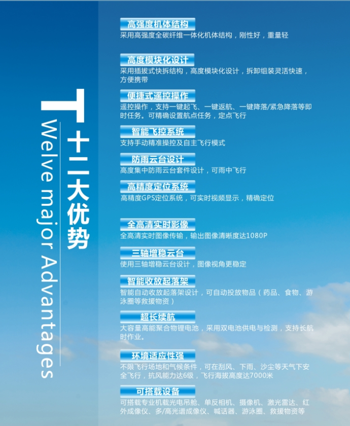 光电吊舱、单反相机、摄像机、激光雷达、红外成像仪、多/高光谱成像仪、喊话器、游泳圈、救援物资等 |