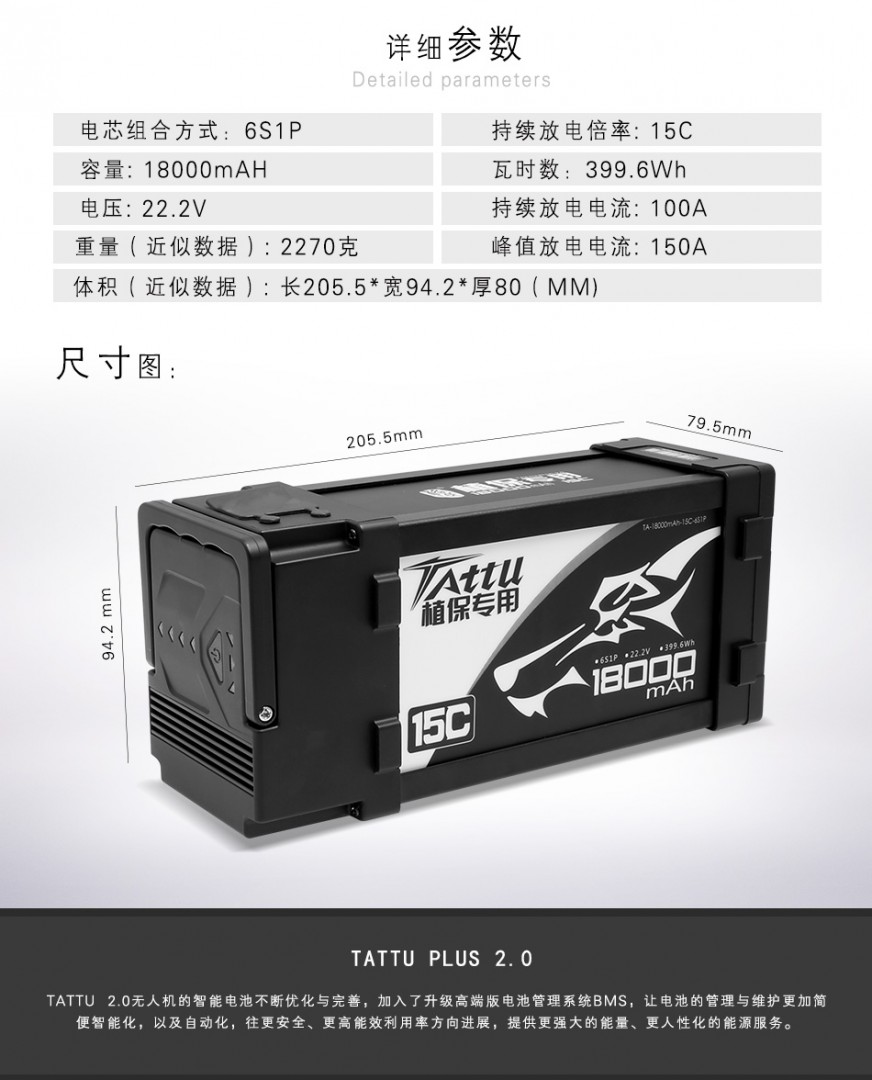无人机植保电池,Tattu Plus 2.0 18000mAh 6s 15C 22.2V,属于Tattu智能版电池,是深圳市格瑞普电池生产的植保专用电池,它是动力之源的VIP管家,高容超续航,植保专用。该电池详细参数及尺寸,请看下图: