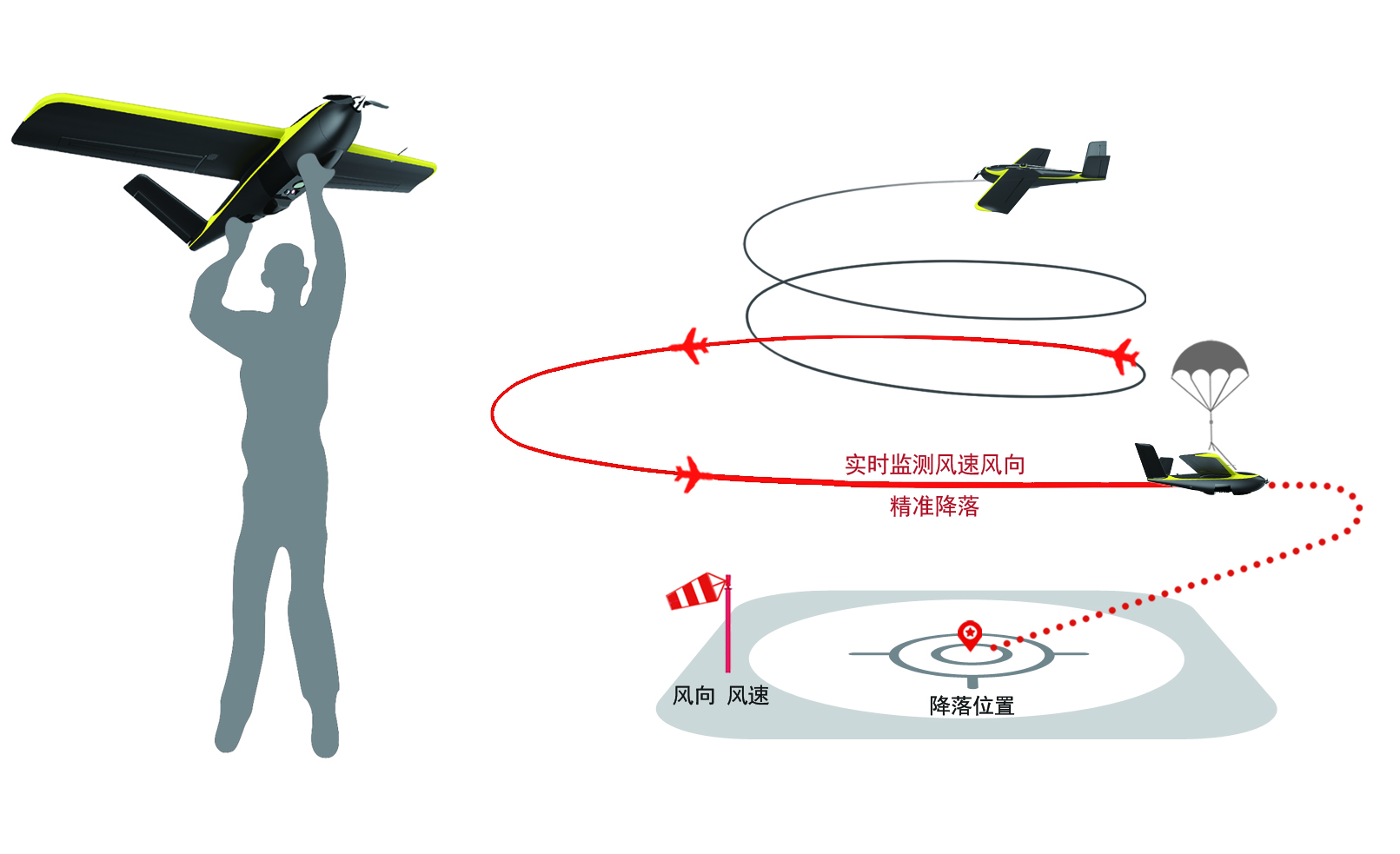 手抛起飞,智能飞行,精准伞降;操作简单,协行方便。