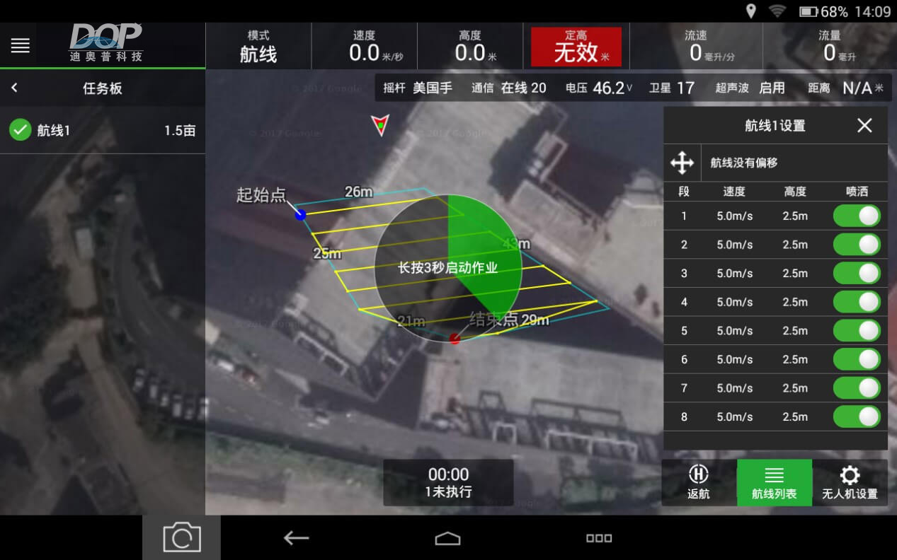 相对于传统飞行器依赖GPS的绝对定高,迪奥普农业植保无人机更符合农田作业的需要。飞行平台加入了地面站自驾飞行系统,可以根据农作物种植区域地面高低不平的变化,保持作业高度的恒定,保障喷洒的质量。