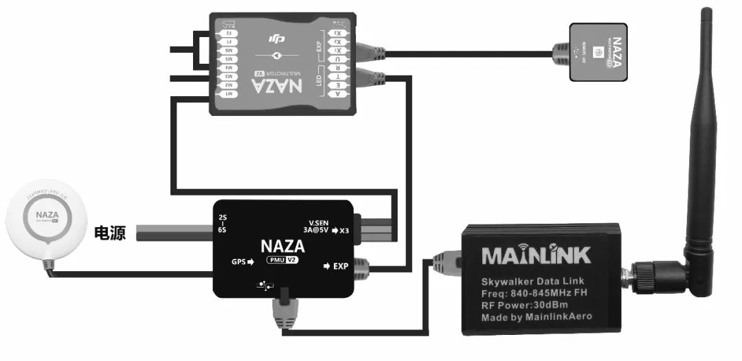 下面以DJI飞控NAZA V2为例进行安装连接,将移动端电台的CAN总线连接至飞控任何一个CAN接口即可。(兼容DJI Naza、wookong、A2等飞控系列)