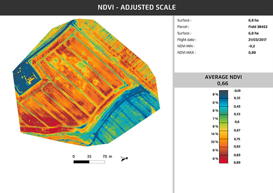 如前所述,使用NDVI图像,经过充分培训的农民可以确定其田地的健康状况并实时做出重要决策。无人机可以半自动地生成地图并指出困难区域,而不是遍历整个种植园或用拖拉机穿越田地。