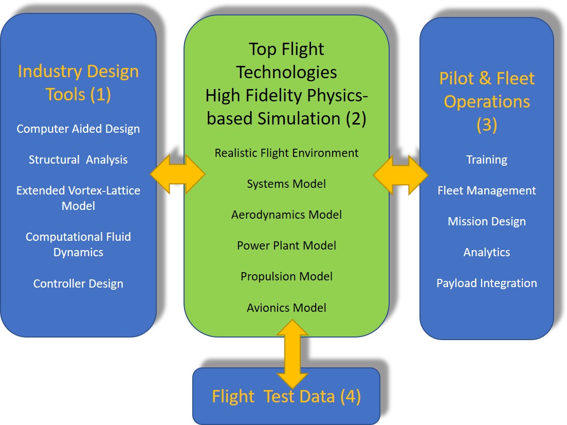 车辆设计工程师将行业工具(1)与Top Flight的基于物理的仿真环境(2)结合使用,以快速迭代车辆设计及其飞行性能。