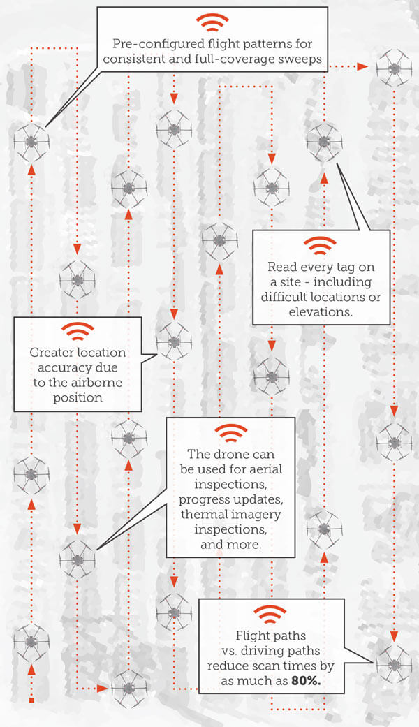 Atlas RFID的专利无人机(又名无人机系统)有效载荷提供了完整的解决方案 - 包括软件集成和硬件。无人机在超大型建筑物堆放场上进行空中扫掠,并与Jovix完全整合。