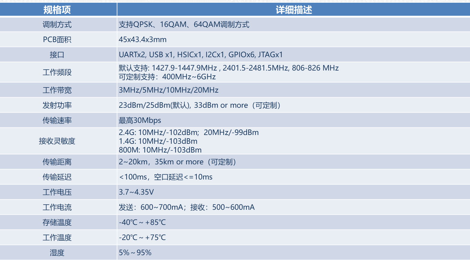 该产品采用OFDM关键技术,支持多种带宽分配,扁平化系统架构设计,有效减少系统延时,提高系统传输能力。 支持700M-2.6GHz频段,最高可达30Mbps速率,支持1080p高清图传。具备传输距离远、数据吞吐量大、抗干扰性强的特点。