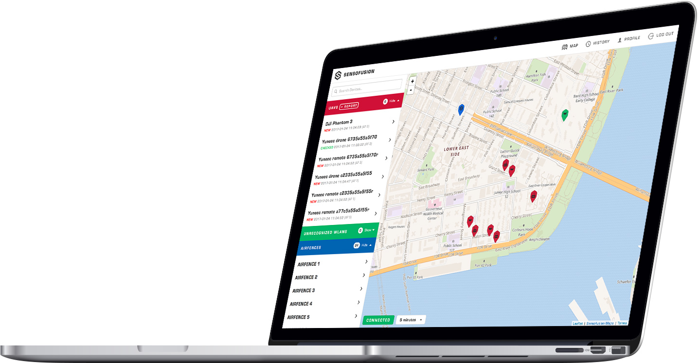 AIRFENCE能够在地图上显示检测到的无人机的实时位置。可以配置Sensofusion地图以进行离线访问。