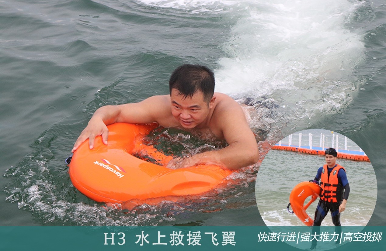 水上救援飞翼是一款定位于救生快艇和传统救生圈之间的智能水上遥控救生设备。该设备融入了无人机、水上机器人救生控制技术,GPS和北斗双定位技术,具有水面快速行进、远距离遥控、正反双面行驶、一键返航和自动返航、定位精准等功能,能够从容应对各种复杂和恶劣的水域。水上救援飞翼通过遥控的方式快速到达落水者身旁,待落水者抓住机身两侧的手带或是抓住中间的横梁后,操作者通过遥控机器至安全地带使落水者成功获救。最多可同时拖拽4人,无需借助漂浮绳进行人工拖动。遇到险情时,可迅速出警,为救援抢险赢得宝贵时间,降低救援风险。