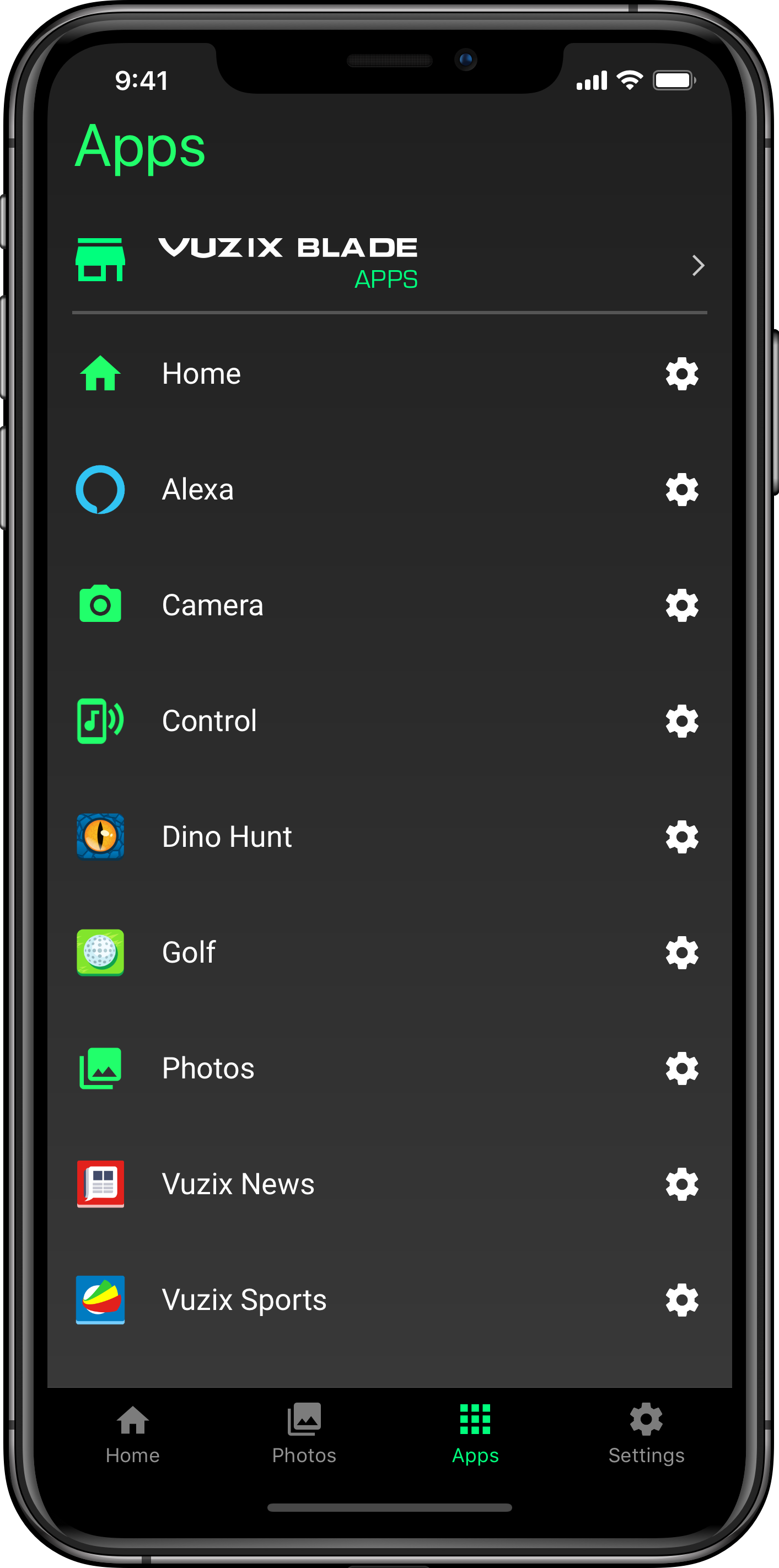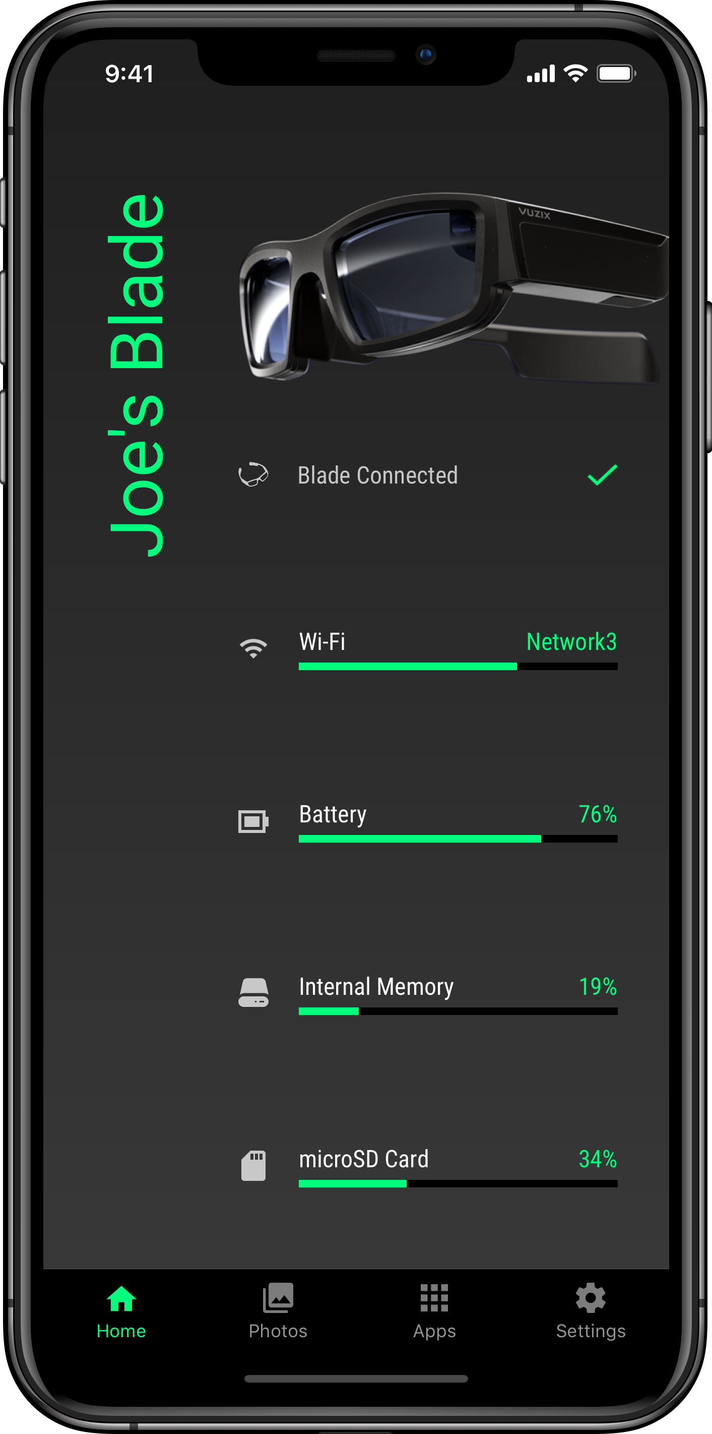 从App Store或Google Play下载并安装Vuzix Blade Companion App。安装完成后,点按“开始设置”,然后按照屏幕上的说明将iOS或Android智能手机与您的刀片连接。Companion App可以轻松设置和自定义刀片,并管理刀片和智能手机之间的通信链接。智能手机上的配套应用程序允许用户管理刀片的应用程序通知,如电子邮件,消息,导航和媒体播放器控制。