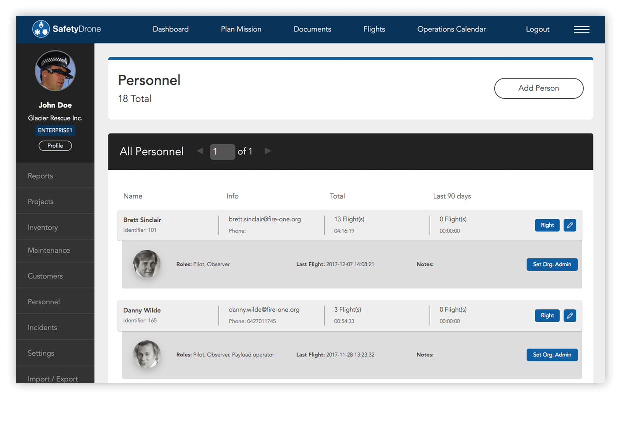 SafetyDrone提供单一存储库,第一响应者可以跟踪他们所有的无人机/无人机相关设备(无人机,电池,设备)。作为我们系统的一部分,我们会跟踪飞行时间并帮助您安排所有无人机相关资产的维护,为您提供即将发生的维护事件的主动通知。我们的图形无人机架构(几何)为我们的用户提供了一个通用标准,可以让您以恒定的方式识别没有序列号的部件(例如识别无人机的“第三臂”)。最后,我们会跟踪您所有运营商的营业时间,并提供货币通知,显示他们的总体体验以及过去90天,提供快速简便的方法来监控熟练程度。