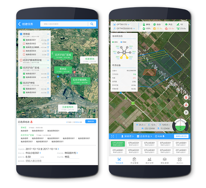 常锋调度监控管理系统不仅能让管理者实时了解飞行器状态,还能实时查看植保区域的作业进展、作业成果和无人机设备的分布情况。根据任务需求预测,实时调度人员和设备,大幅提升团队运转效率。支持电子围栏、远程锁机、作业统计、追溯使用记录等功能,飞行数据可接入民航局,符合国家安全要求。