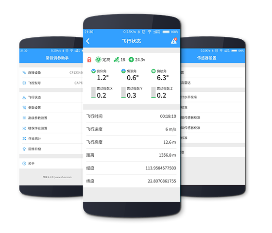 C1-A配备专业的调参软件,支持飞行器姿态、高度、震动等状态查看,可进行传感器校准、流量计校准、动力校准、作业设置、飞行参数设置等调试,即学即入门,大大提高装机、测机、培训等方面的效率以及植保机成品率。