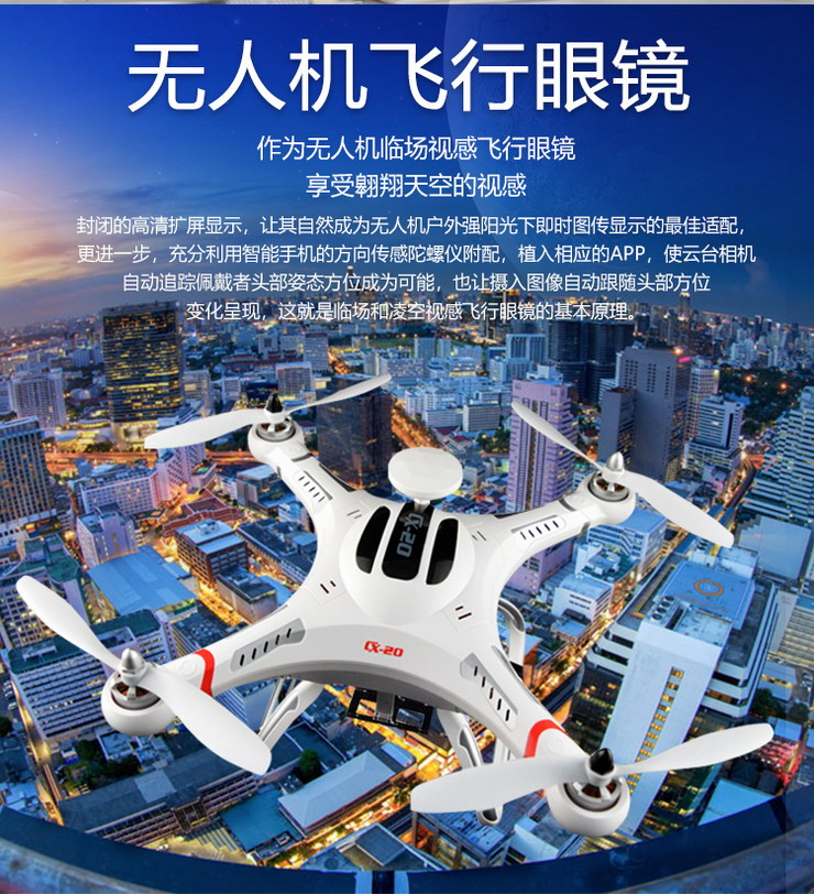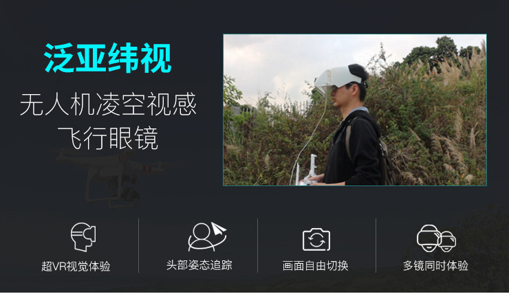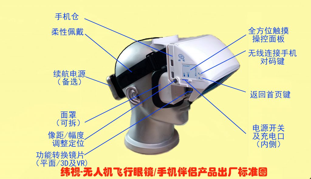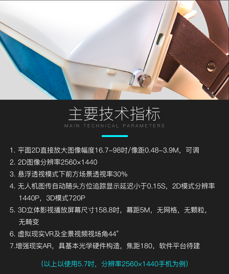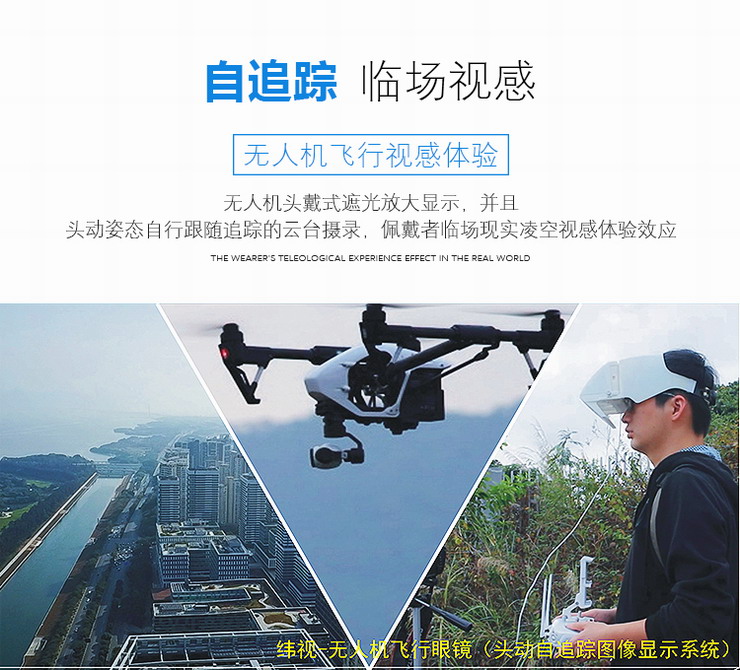 5.作为云台拍摄和图传显示随佩戴者头动头姿自动追踪相应呈现,暂只适配大疆系列机型使用,且需下载安装“屏幕旋转控制程序”和“纬视-无人机自动追踪图像系统”,其它品牌机型有待其开放内部通信接口方可达到随动追踪呈现效果,但一样可以作为其室外强光下手机虚拟投影头盔镜方式高清显示的理想工具,且只按普通“多功能手机伴侣”价格执行;