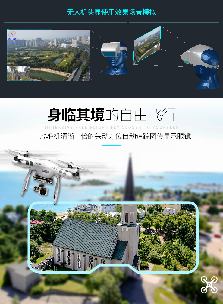 ※附加说明:无人机领域,特别是即时勘查巡检,风景鸟瞰欣赏与拍摄,即时图像监视是目前的重中之重,户外旅游/作业并不适合携带大型显示器材,而大部分大小显示器包括手机都是室内型的,在户外强光下效果很差,即使高端配置室外型强光小型显示器其尺寸也非常小,即时观感勉强。曾经时髦的头戴式视频眼镜显示器分辨指标也不甚理想且价格奇高(x软和爱x生智能眼镜解析分辨率也就区区640P),尝试流行的VR头盔眼镜也基本是过去视频眼镜的类似套路结构,其左右分屏的显示模式严重削减了50%以上的分辨率指标,更没有佩戴者头部运动自追踪的临场现实感受功能,我们现在向市场推出的独家专利产品-头动追踪手机头盔式显示装置,彻底摆脱了传统思路,以专利技术创造性地构建了这举世无双的多功能光学-智能手机头盔式穿戴高清晰结构体系,首先是解决图像显示大小和分辨率问题,然后,借助现有的高端智能手机的内传感器配置和其它配置,无缝地上行传输控制,实现了云台摄像机/下行即时图像显示画面对佩戴者头部姿态自动追踪同步,达到操作者强烈身临飞机上的高清晰凌空视觉感受,即‘泛亚纬视’机上凌空视感技术,而且,显示图像虚拟尺寸可以根据用户的眼睛喜好17-95吋自由调整,这是绝无仅有的。同时,这个“头盔眼镜”也是非常实用的多功能手机伴侣产品,其使用功能全部攘括我们另一款产即“多功能手机伴侣”,完美地实现了一机多用。