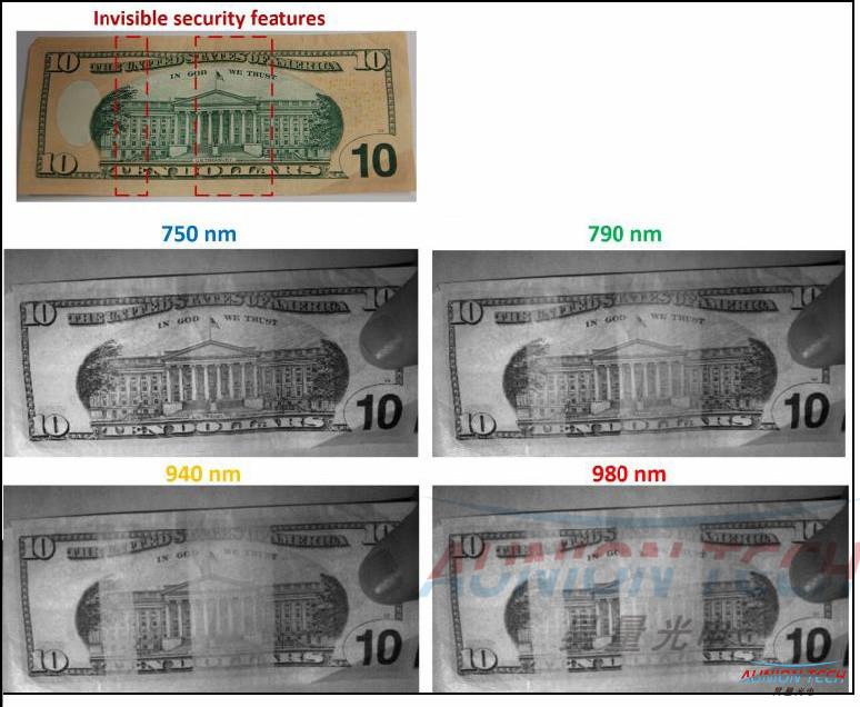 上图为一个美金的成像的例子。其中最上边是一副普通相机拍摄的彩色的白炽灯照射的图片。红色框中框出的是不可见的防伪特征。下边四幅图是我们MCam同时拍摄的四幅不同波段的同一张美金钞票的图像(750 nm, 790 nm, 940 nm, 980 nm)。从结果上看,防伪特征无法被普通的彩色相机识别,但在790 nm, 940 nm, 980 nm的图像上却非常清晰,尤其是980nm的图像上尤为明显。
