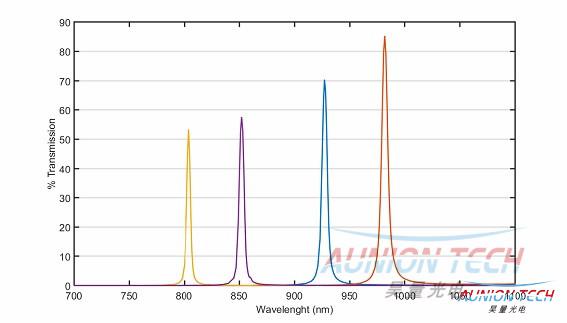 案例,四通道多光谱相机,波长分别为 800 nm , 850 nm, 930 nm, 980 nm。从如上图中可以看到我们独特的微结构滤波片的独具的高透过率及窄线宽的特点。同时客户也可以看出我们滤光片对带外的光的极好的过滤效果。