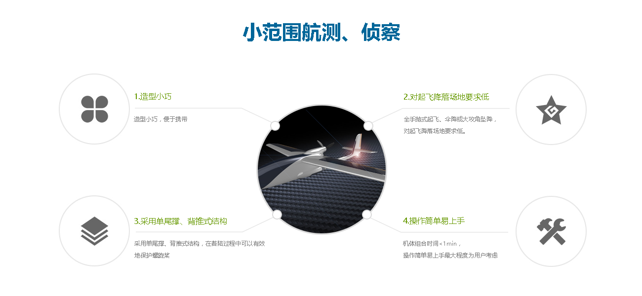该款飞机采用全手抛式起飞,单人即可操作,对起飞降落场地要求低,只要空域良好即可随即进入工作,电动动力可在高海拔地区作业,足够大的剩余功率可在大风中安全回收。