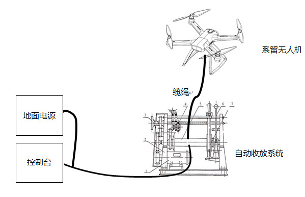 系留无人机通过缆绳获得地面电源提供的动力,并通过缆绳中的信号通道将无人机携带负载所需传回的数据连接到地面控制台,缆绳的收放由自动收放系统进行控制,保证整个无人机系统动作协同一致。