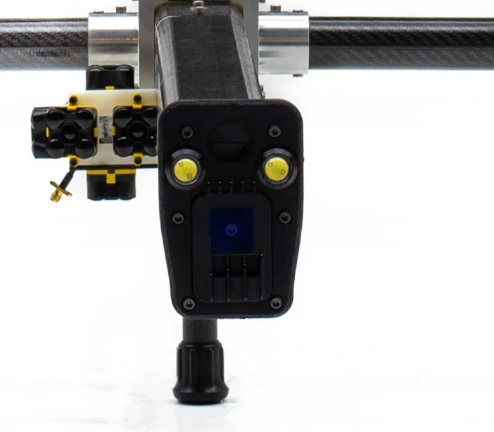 This sensor fits on the end of Astria's payload arm. When positioned close to a wall, this crack width measurement sensor can identify and measure all of the cracks in the field of view. It beats rappelling down and using a crack card by a mile. This sensor is currently undergoing lab and field testing. Since the sensor integrates a AI-enabled camera, future software updates will allow other measurement and characterization tasks.