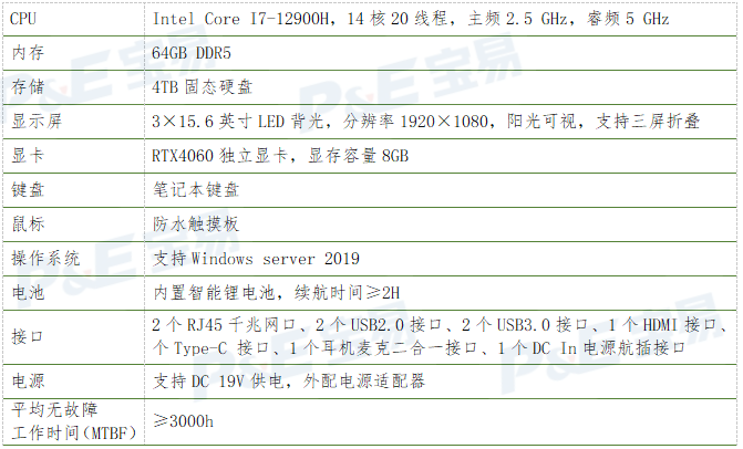宝易PER-J15A1701-QT采用三块15.6英寸高清液晶显示屏,支持三屏折叠,支持Windows、银河麒麟等Linux操作系统,电源接口使用航插连接器,IP54防护等级,具有振动、冲击等特性为一体,适应于户外携行、车载、船载等各类严苛环境,可满足数据采集、图像处理、指挥控制等应用场景的计算需求。