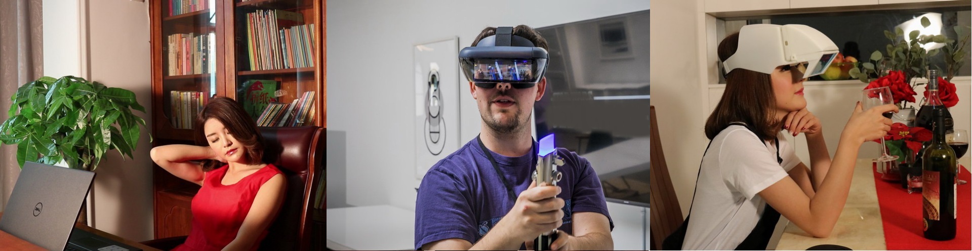 千呼万呼,这期待已久的手机多功能穿戴拓展和用户体验突破性改善装置终于在我们的努力下诞生了,也就是说,普通手机只要下载几个APP程序,插入我们这个时尚集成头盔内,就可以像普通大电脑一样,在17—95吋虚拟大屏幕下头盔侧触摸操作或无线蓝牙鼠标操作,清晰地游览网页、查看微信、短信等,并且打电话不耽误。也可以实现从17到95吋自由调节地观看普通视频节目的大屏幕高清电影电视效果,手机微信迷们也不再在窄小的屏幕上低头委屈地欣赏朋友圈里精彩丰富的微信视频了,甚至可以切换悬浮透视显示功能让我们做家务、步行或者坐车不耽误观看精彩视频节目,同时也不妨碍前方现实场景视线的安全透视模式(本功能首发产品暂不给与配备)。所有这些功能,对一般程度的近视或老花视力屈光者甚至可以丢开眼镜使用,另外,启动对桌面办公电脑的远程控制或无线转移显示功能,对每天坐在桌面电脑旁十几小时的IT一族来说,通过头显转移显示桌面电脑屏幕,减缓过去单调盯屏模式的枯燥与“痛苦”,彻底改善腰颈椎长期单一固定状态的职业疲劳危害,在WiFi范围内通过蓝牙空中键鼠自由自在或躺在沙发上任意姿态地操作自己的桌面电脑。而最值得称颂的是这个时尚头盔还全面兼顾了流行的虚拟现实VR眼镜/3D成像显示头盔的一切功能、微软HOLOLENS增强现实全景眼镜的部分类似功能以及无人机头戴式大屏幕户外遮光显示和第一现场第一视角智能头部追踪,机上凌空视感功能。看3D电影节目,玩虚拟现实沉浸和游戏也随手拈来,尤其3D影视播放的清晰度等指标媲美商业影院效果,更是普通VR头盔眼镜难以比拟的(结构体制不一)。无人机的野外活动的发烧友们,再也不用为过去的小小显示屏和户外强光干扰显示叫屈了,更不必花费高昂代价去选配传统的所谓较高分辨率视频眼镜显示器或者凑合使用左右分屏削减50%以上分辨率指标的VR眼镜机了......。本机特别是启动头部追踪功能APP后无人机操作者可以身临其境的凌空机上的超级现场感受即“泛亚纬视---机上凌空视感技术”。通过近四年的沉寂和不懈努力、无数次的试验和改进,以及多项知识产权的申报注册完成,这个“纬视-多功能手机伴侣/无人机飞行眼镜”时尚穿戴装置终于到了量产阶段,而且售价不高,相信,不久的将来,我们每一个手机用户都能分享到这一物美价廉的实用新型科技发明了,其作为全面改变IT视界之格局,我们拭目以待!