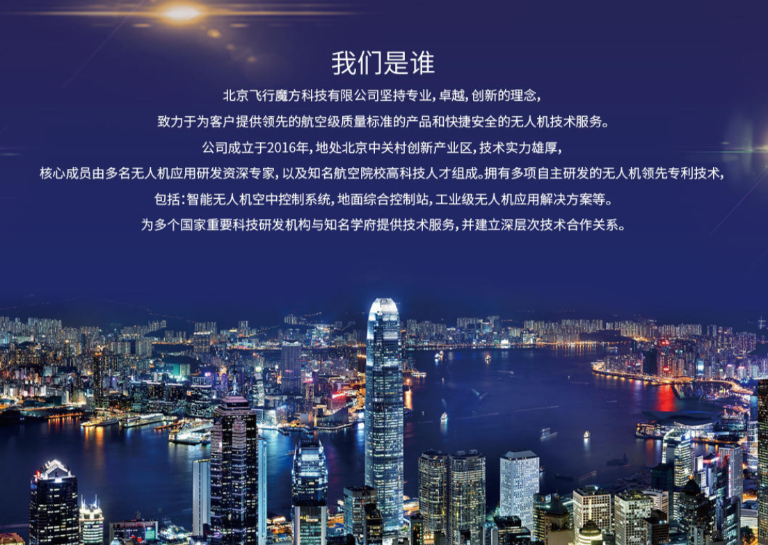 飞行魔方科技成立于是2016年,我们是一家专注利用无人机给用户带来更酷更轻松体验的科技公司,创立至今为几十位客户提供了创新与专业的无人机设计方案和产品。我们在成熟无人机产品的基础上提供更多有价值的创新实用方案,范围包含无人机娱乐体验,集群表演,超长航时空中监控,行业定制等。我们的价值与宗旨是为无人机更好的服务于用户和客户,让无人机的价值得到持续的体现。