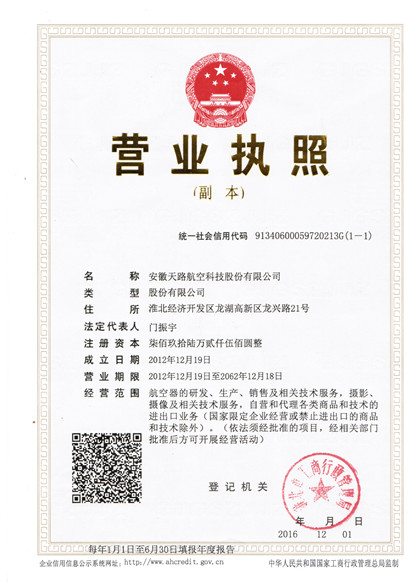 | 公司名称: | 安徽天路航空科技股份有限公司 | 注册地址: | 淮北经济开发区龙湖高新区龙兴路21号 |
