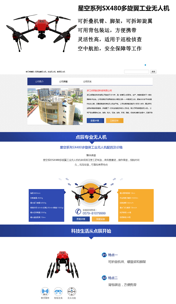 浙江点辰航空科技有限公司始创于2015年,是一家集无人机研发、生产、销售和服务于一体的高新技术企业。,公司秉承“创新卓越,智能制造,航空品质,服务至上”的经营理念,致力于为客户提供具有航空质量标准的工业机无人机产品和技术服务,推动无人机产业的发展。公司总部位于世界著名的小商品之都——中国浙江义乌,拥有3000多平米的现代化办公楼,已建成数条标准化无人机生产线。
