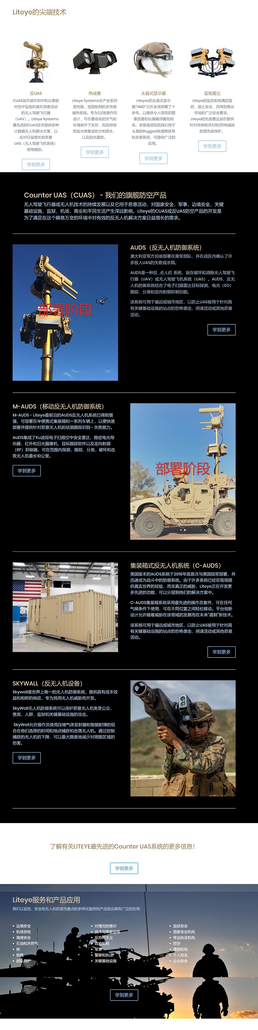 美国科罗拉多州Liteye Systems Inc是一家做无人机反制系统的公司,在设计,制造和供应计数器无人机系统(AUDS),头盔式显示系统(HMD),监视雷达和热成像产品方面处于世界领先地位,可用于各种国防和国土安全应用。Liteye产品也适用于某些高端商业安全应用。