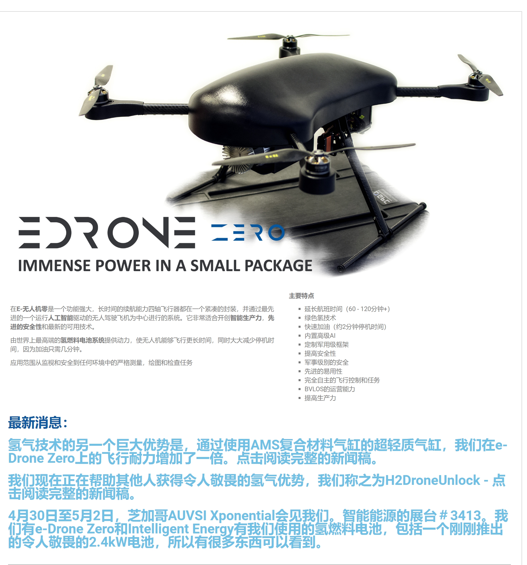 e-Drone Zero是一款功能强大的长续航四轴飞行器,专为商业市场设计。它采用紧凑的定制军用级框架,由Intelligent Energy开发的独特风冷氢燃料电池模块提供动力。该系统由最先进的人工智能操作系统之一管理。扩展范围是通过交换原来的1.5L气缸,重量约1kg,用于AMS创新的新型3L碳纤维复合气缸。这是当今世界上同类产品中最轻的气缸之一 - 提供之前e-Drone Zero气缸的两倍气体容量,同时系统重量仅增加600g。