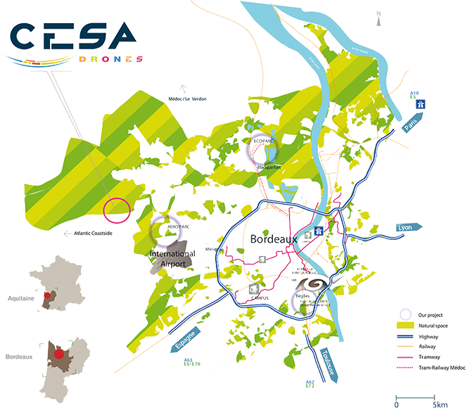 来自波尔多Technowest技术园区、DGAC-SO、阿奎廷地区委员会和国防部的合作,CESA允许企业在合适的环境中开发和评估其产品(矢量和有效载荷)。无人驾驶飞机位于马蒂尼亚斯·贾勒和圣麦达德-贾尔斯两个市镇的苏格军营,有一个隔离的领空(SIA发布的R 247A/B区),永久上限为2000英尺。CSSA为自主系统提供飞行基础设施和嵌入式服务,让用户符合法国的规定。