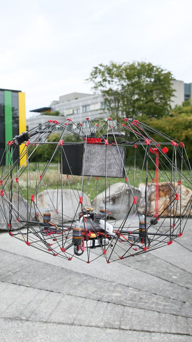 被称为“PackDrone”的无人机是一个集成在可折叠保护笼内的四轴飞行器。保持架将螺旋桨与外部环境隔开,使无人机对人类安全。此外,笼子在靠近障碍物的同时保护无人机的元件。包裹被封闭在该结构中并且易于接近。