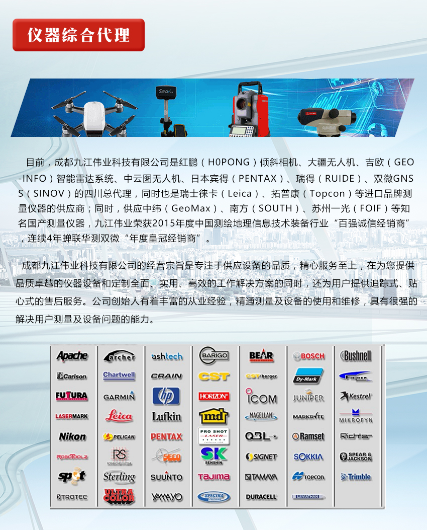 成都九江伟业科技有限公司,成立于2013年,为【大疆无人机】四川总代,是【大疆慧飞】UTC无人机测绘技术培训分校(四川西藏独家)。属南京中云图集团的投资公司之一,服务遍布全国,被多次评为中国测绘地理信息技术装备行业“百强诚信经销商”。公司率先进行实景三维倾斜技术的研发、生产及推广,自建数据处理中心,在无人机航测普及化进程处于行业先行者位置,已成为测绘及周边领域全流程综合服务商,在为客户提供品质卓越的仪器设备和定制全面、实用、高效的工作解决方案的同时,还为用户提供追踪式的贴心售后服务。