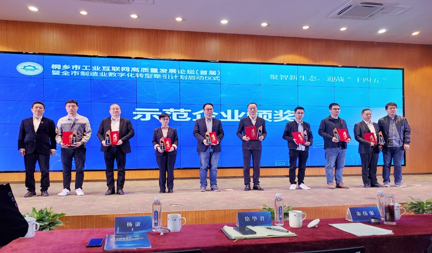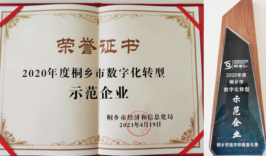 2021年4月19日,首届制造业数字化转型牵引计划启动仪式及制造业数字化转型优秀示范企业颁奖活动在桐乡市数字经济小镇国际会议中心举行,我公司获得了桐乡市2020年数字化转型优秀示范企业称号。