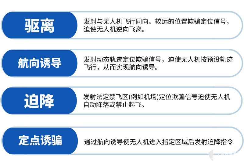 系统通过集成频谱、光电、雷达探测、导航诱骗、无线电干扰等多种反制策略,对各型入侵无人机产生不同的反制效果。
