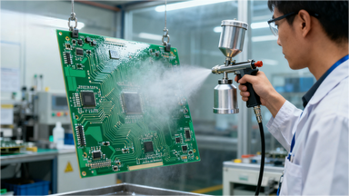 喷枪喷出的细腻雾状涂层均匀覆盖在PCBA表面