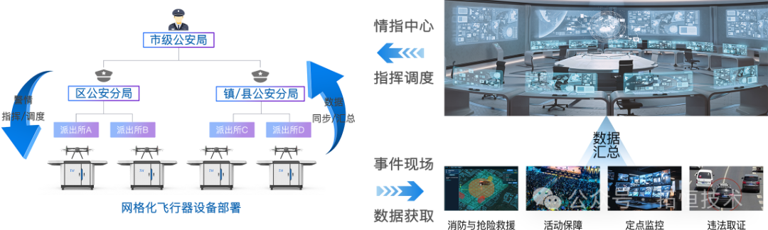 本方案以“空地协同”为核心定位,致力于构建“空中+地面”一体化巡防体系,在设计上贯彻“四个一体化”理念:通过无人机引入空中视角,实现监控覆盖一体化,弥补传统视频盲区;依托“一网统飞”平台,实现设备调度与管理一体化,提升装备使用效能;借助实时数据同步与智能指令系统,实现指挥与执行一体化,确保信息畅通、响应迅速;并基于全流程数据沉淀与分析,推动巡检与决策一体化,赋能警务模式从“被动处置”向“主动预防”转型。系统本质上是一座连接指挥与现场的智能“中转站”,也是一张融合多维感知数据的立体“展示台”。