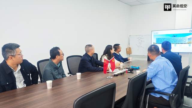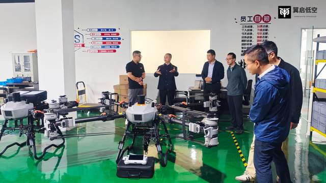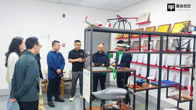 在蔡东阳总经理的陪同下,殷文昌主任一行首先参观了翼启低空成都总部研发中心,实地了解了企业在无人机系统研发、行业应用解决方案、低空经济产业布局等方面的最新成果。翼启低空近年来在农业植保、测绘巡检、应急救援等领域积累了大量实战案例,自主研发的无人机平台及配套软硬件设施给来访教师留下了深刻印象。